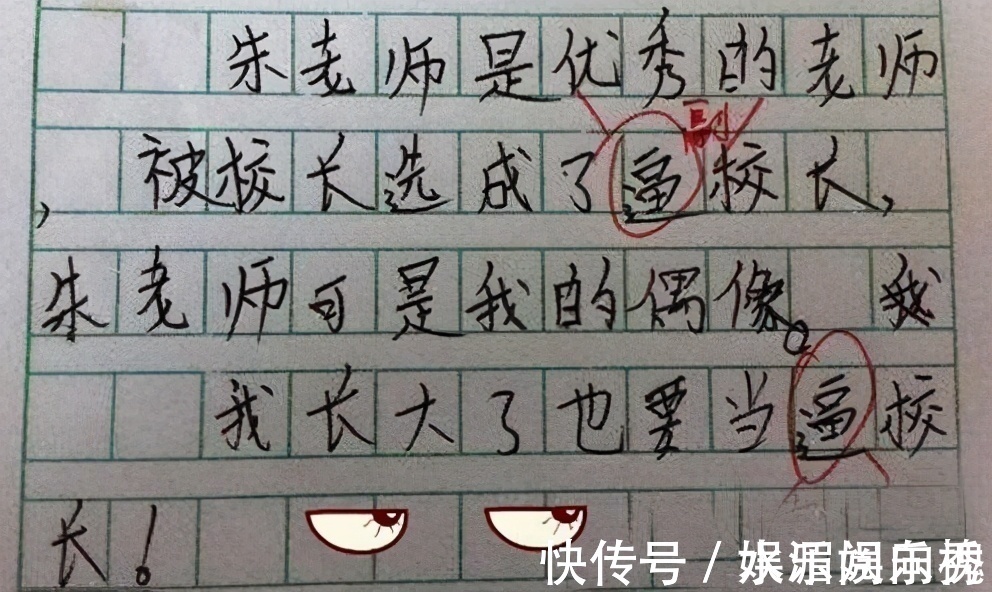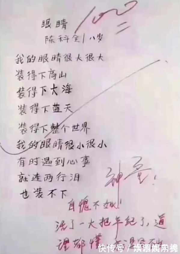 第二篇:《眼睛》这位小学生看起来很有才华,写出来的作文也非常有寓意,老师给出了100分的成绩,并且还夸他是一位神童!不得不承认,这位小学生确实是有一定的水平的,否则也不可能写出这样的作文来,希望大家都能够向他学习。