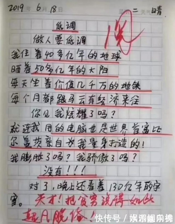 第三篇:《低调》这位小学生的作文题目叫《低调》,写的是自己现在用的东西都是最好的,但是自己却并没有因此而骄傲,老师看完之后笑到肚子疼,这明明就是穷!