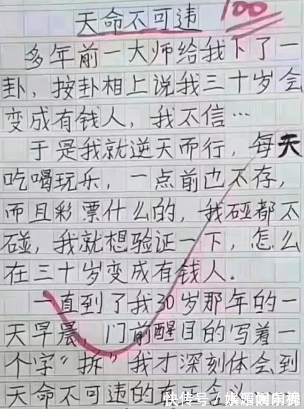不过还是给出了评语,夸他是个天才,网友看了也纷纷表示自愧不如。虽然这位同学说的都很有道理,但是也能看出来他身上有一种安于现状的精神,希望大家在学习的时候能够力争上游,做一个优秀的人,而不应该满足于现状。小学生为什么会写出这样的作文的呢?1. 对于作文的理解有误由于小学生才处于写作文的初期,所以对于写作文的方式方法还没有完全掌握,因此在写作文的时候,就容易误会作文的内容,所以就会写出来一些让大家看起来哭笑不得的作文。希望可以在写作上多加练习,争取写出好的作文来。