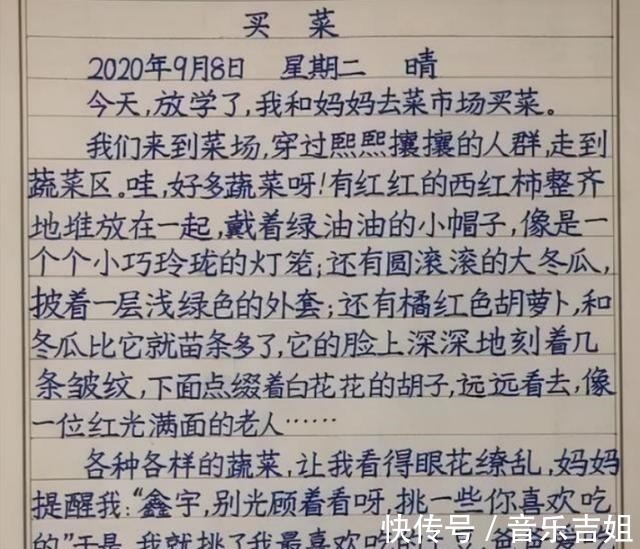 这篇日记《买菜》,光看内容,就已经为之折服,用词非常准确,而且语言丰富优美,写作手法也很吸引人,是一篇佳作。再看字体,就更令人惊讶,一个小学生的写作水平和书写水平都如此出彩,老师一定会很喜欢。